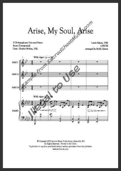Includes the full-transposed score, piano accompaniment and parts 1-2 for B-flat Tenor saxophones and part 3 for E-flat Baritone saxophone.