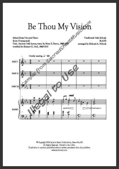 Includes the full transposed score, piano accompaniment, parts 1 & 2 for B-flat Trumpet and part 3 for Trombone. Alternate parts include part 2 for Horn in F and part 3 for T. C. Euphonium.