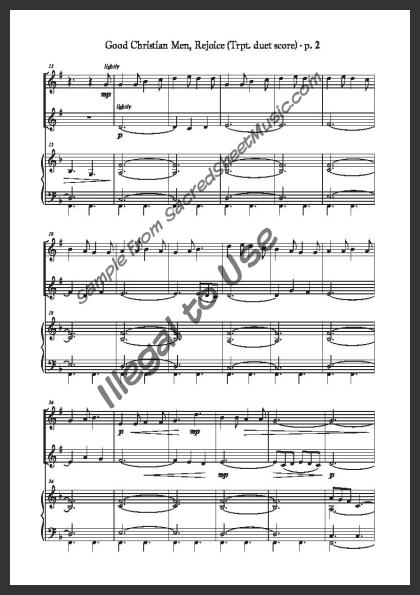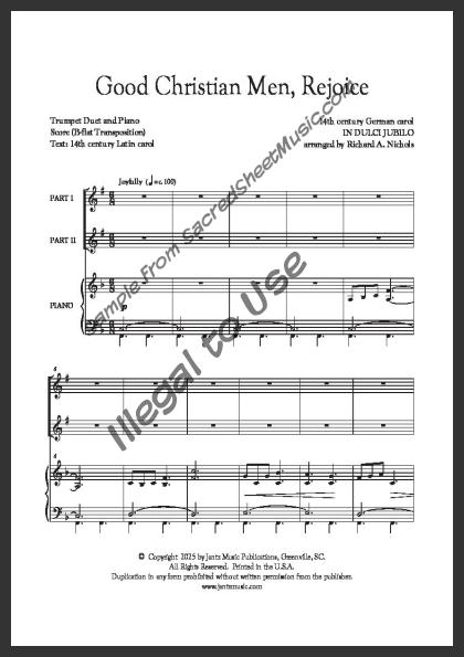 Includes the full transposed score with piano accompaniment and separate duet parts for B-flat Trumpet I and II.