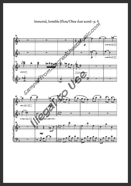 Includes the full score with piano accompaniment and separate duet parts for Flute I and Oboe II.