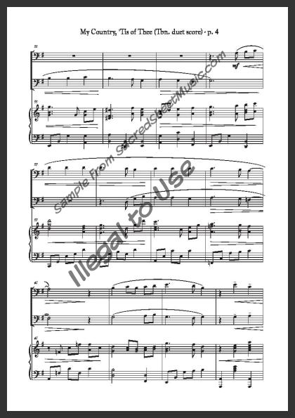 Trombone duet with piano accompaniment. A powerful, fresh setting of this popular American patriotic song – “America.”. Moderately level of difficulty.
