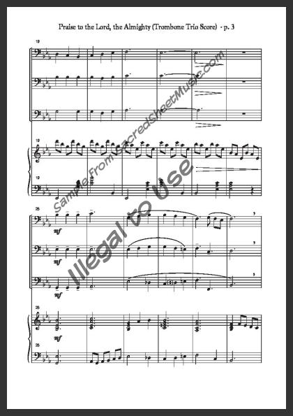 An arrangement for three trombones with piano accompaniment. A majestic, flowing setting of this great hymn of praise to our Creator and Savior – ‘Praise to the Lord, the Almighty, the King of creation! … Join me in glad adoration.’ Moderate level of difficulty.