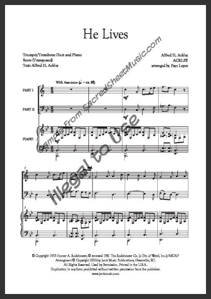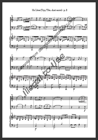 Includes the full transposed score with piano accompaniment and separate duet parts for B-flat Trumpet I and Trombone II.