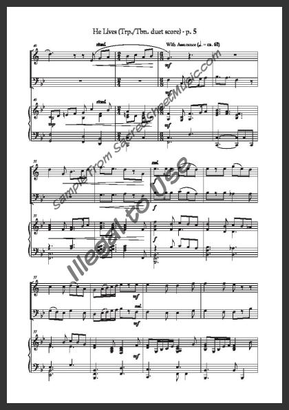 Mixed brass duet with piano accompaniment for trumpet and trombone. A bright, uplifting arrangement that celebrates Christ’s resurrection – ‘I serve a risen Savior.’. Moderately Advanced level of difficulty.