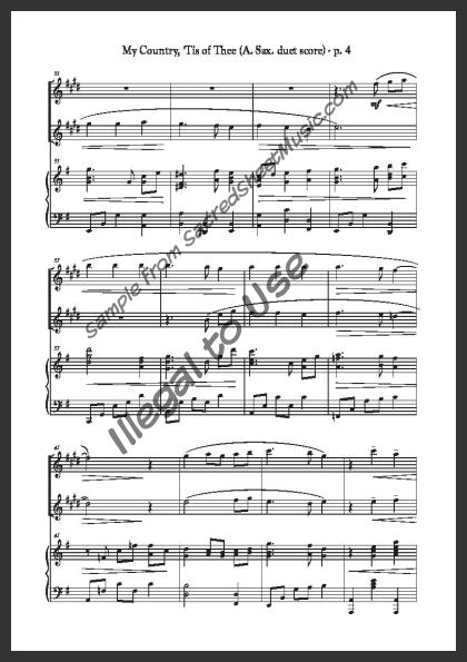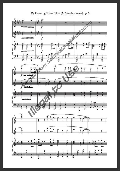 Alto Saxophone duet with piano accompaniment. A powerful, fresh setting of this popular American patriotic song – “America.”. Moderately level of difficulty.