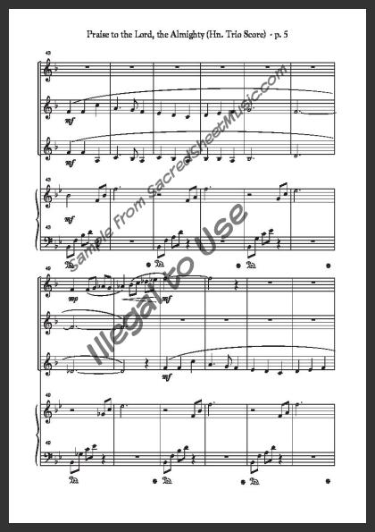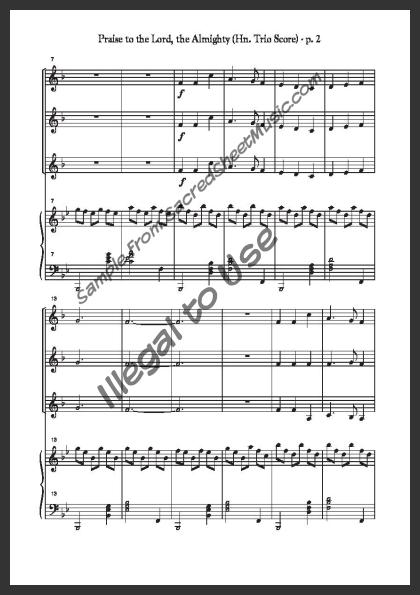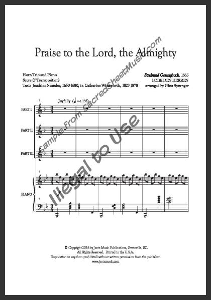 A three-part arrangement for three horns with piano accompaniment. A majestic, flowing setting of this great hymn of praise to our Creator and Savior – ‘Praise to the Lord, the Almighty, the King of creation! … Join me in glad adoration.’ Moderate level of difficulty.