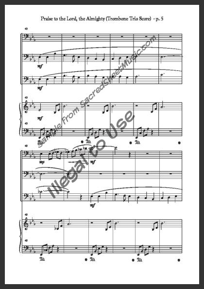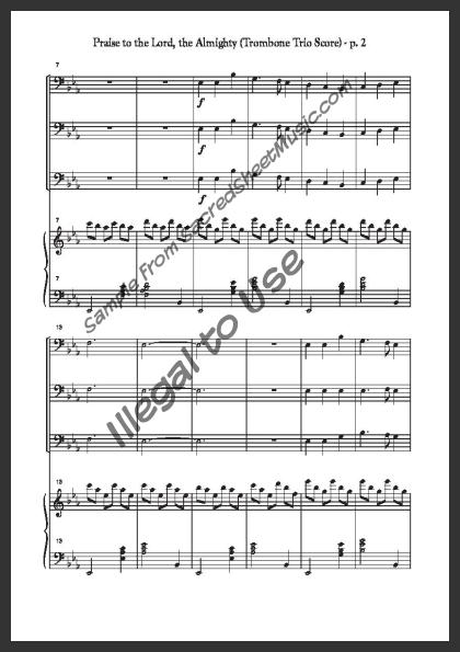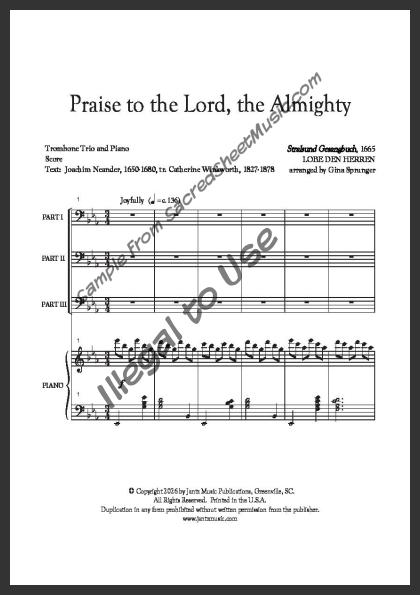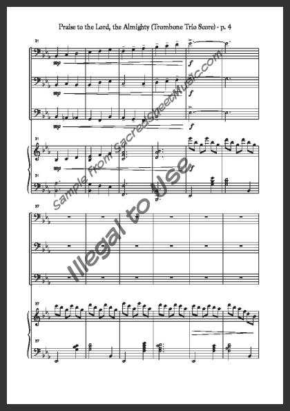 An arrangement for three trombones with piano accompaniment. A majestic, flowing setting of this great hymn of praise to our Creator and Savior – ‘Praise to the Lord, the Almighty, the King of creation! … Join me in glad adoration.’ Moderate level of difficulty.