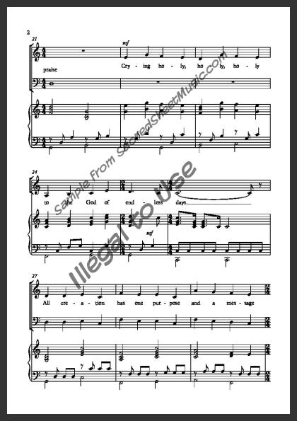 This work is conceived as a sacred symphonic anthem, intended to convey the grandeur of God's holiness through restraint and musical pacing. The impact of this piece will be felt not through constant volume, but through dynamic expression and delayed climactic release. Singers are encouraged to sing long phrases. adhere to clean cutoffs, and reverent pacing, allowing silence and resonance to carry theological weight. The work unfolds from mystery to proclamation, from the heavenly hosts extoling God in all His power and majesty to an invitation to participate in celebrating Christ's triumph. It finally settles into a reverential moment of unashamed worship, an Alleluia of radiant stillness.